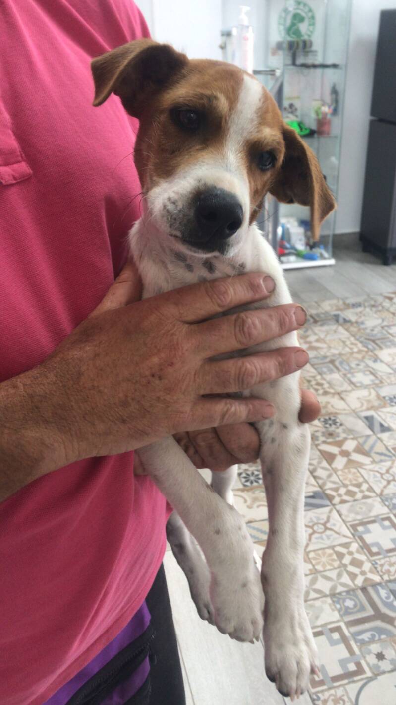 Ook puppy Manolin is gered door Rescate. Deze kleine rakker was vastgebonden met een touw aan een lantaarnpaal. De lijn zat zo strak dat Manolin aan het stikken was. Gelukkig is hij nu veilig.. maar nog niet veilig in een mooie grote puppy kennel.