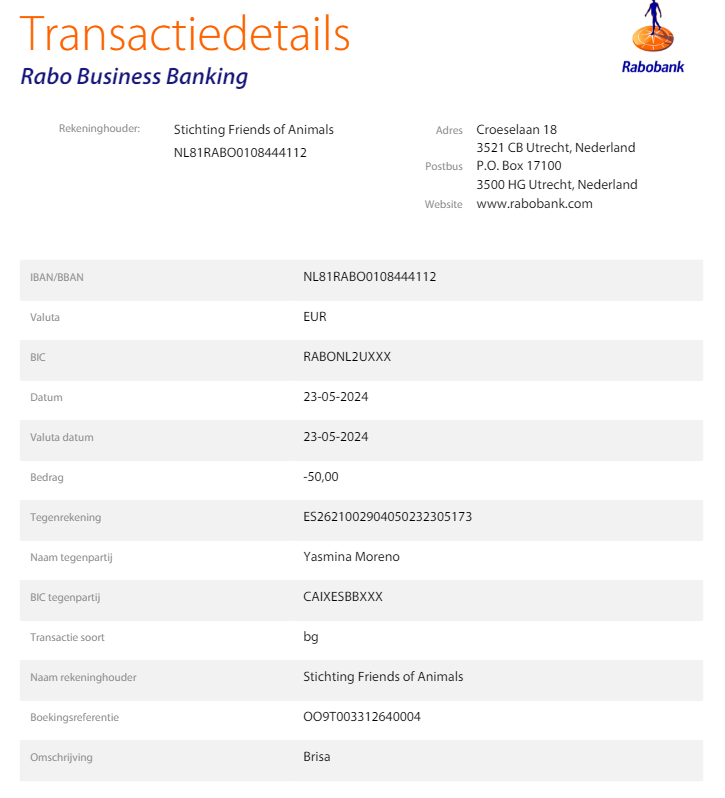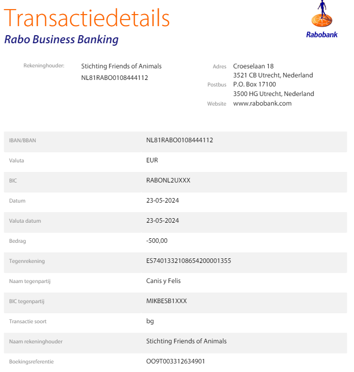 Vandaag hebben we het geld van de sponsoring van de honden en katten overgemaakt naar Canis y Felis en Yazmina.