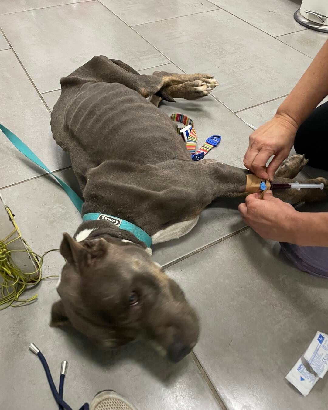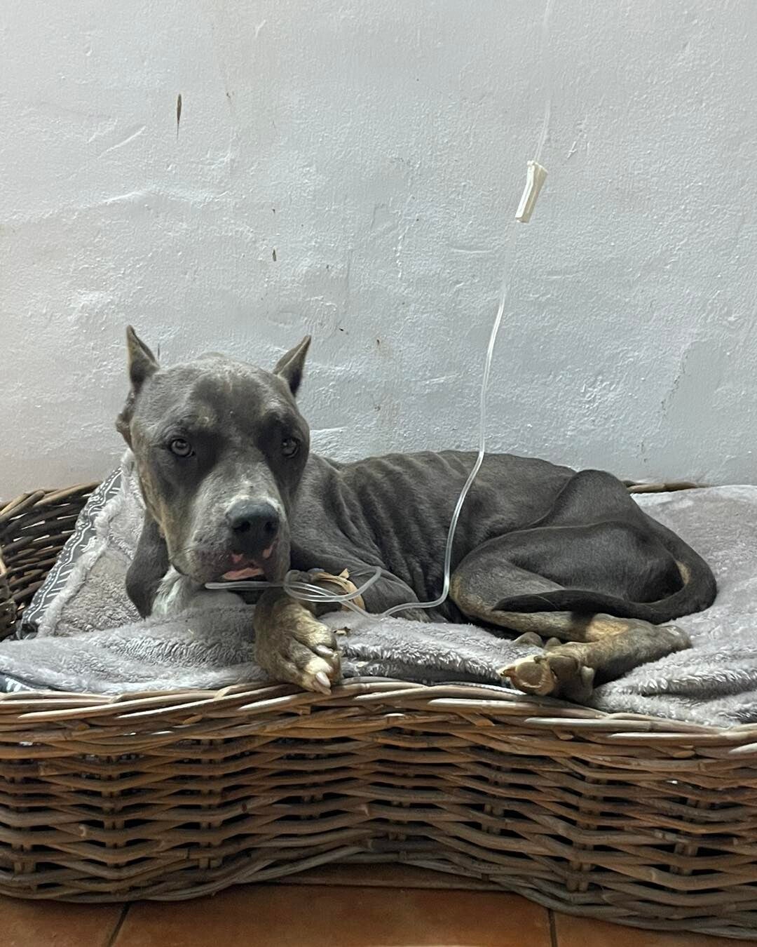 Ze eet als of er geen morgen, ze is rustig, aanhankelijk en ongeveer 6-8 jaar. Georgina is kapot gemaakt door de vele bevallingen die ze heeft gehad. Ze is gisteravond naar de kliniek gebracht waar ze gelijk aan het infuus is gekomen. Eerst het vocht op peil brengen en dan kan ze verdere onderzoeken krijgen, wellicht bloedtransfusies..