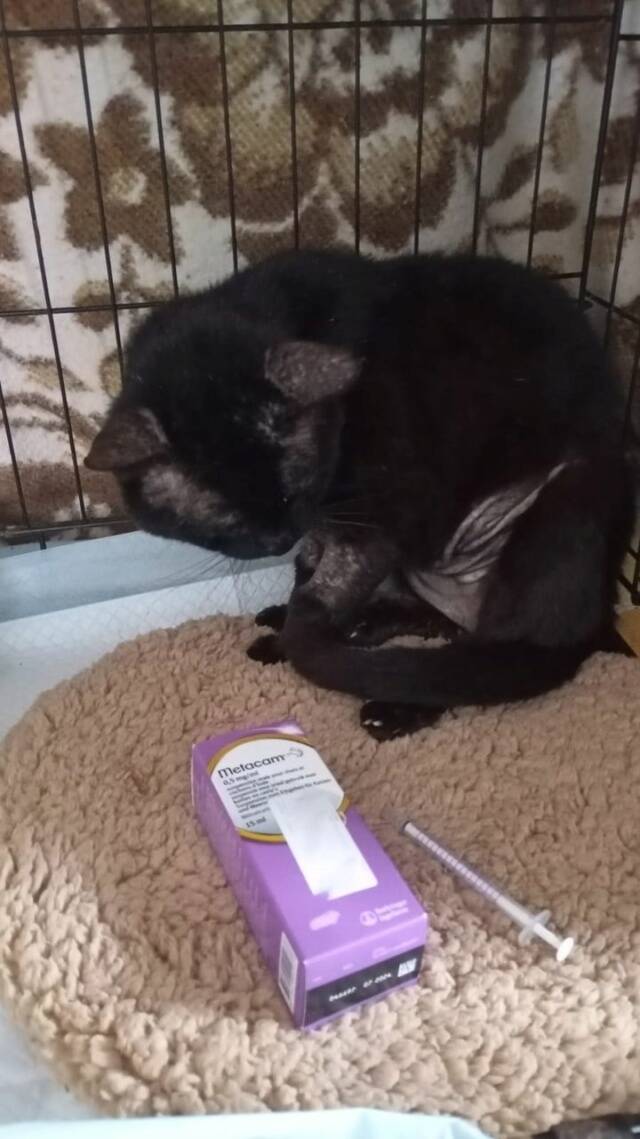 Nu heeft hij deze geweldige dekens, warm, zacht herstelvoedsel is wat hij nodig heeft, en METACAM, zijn medicijn tegen pijn, evenals een nieuwe voerbak.