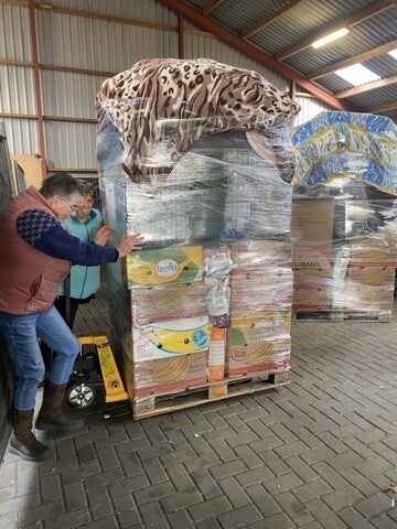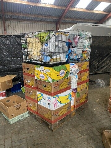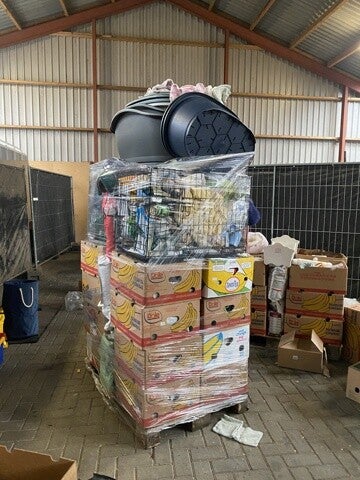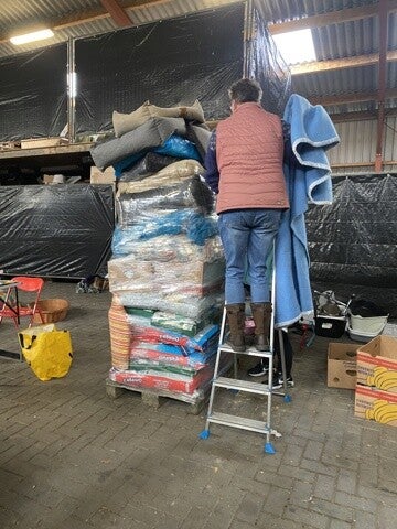 Maarten was al vroeg aanwezig en had de hele aanhanger van gisteren al leeg gepakt. Sandra Veldhuizen, Marijke Lam en Harriët zijn aan de slag gegaan en we hebben vandaag 3 pallets opgebouwd.