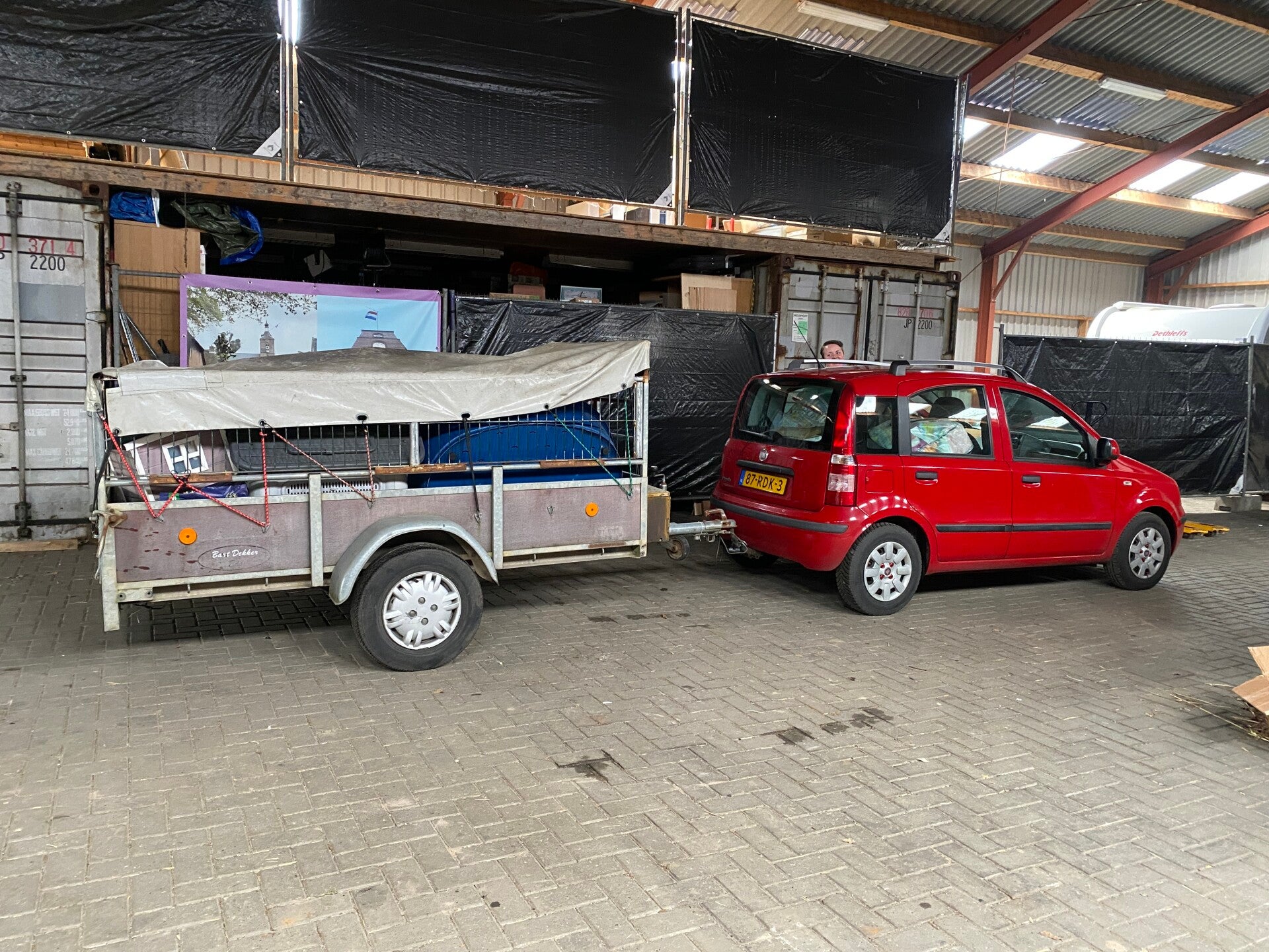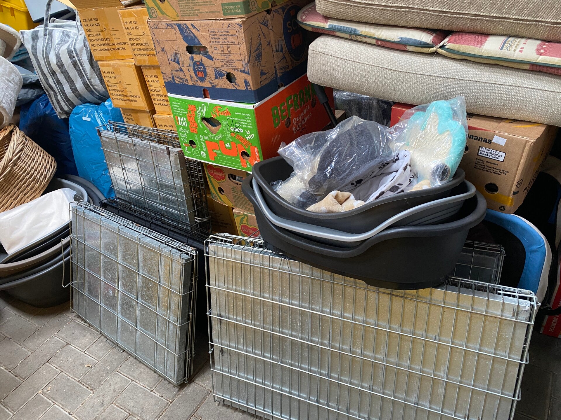 Gelijk erna kwam Lisa uit Westervoort met een auto en aanhanger vol… prachtige donaties die ze de afgelopen tijd had opgehaald. Textiel, kunststof manden, benchen, 2 prachtige hondenhokken, rieten manden, meerdere krabpalen en wat zakken voer.