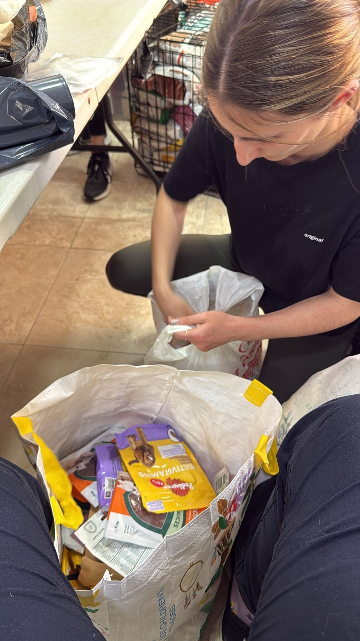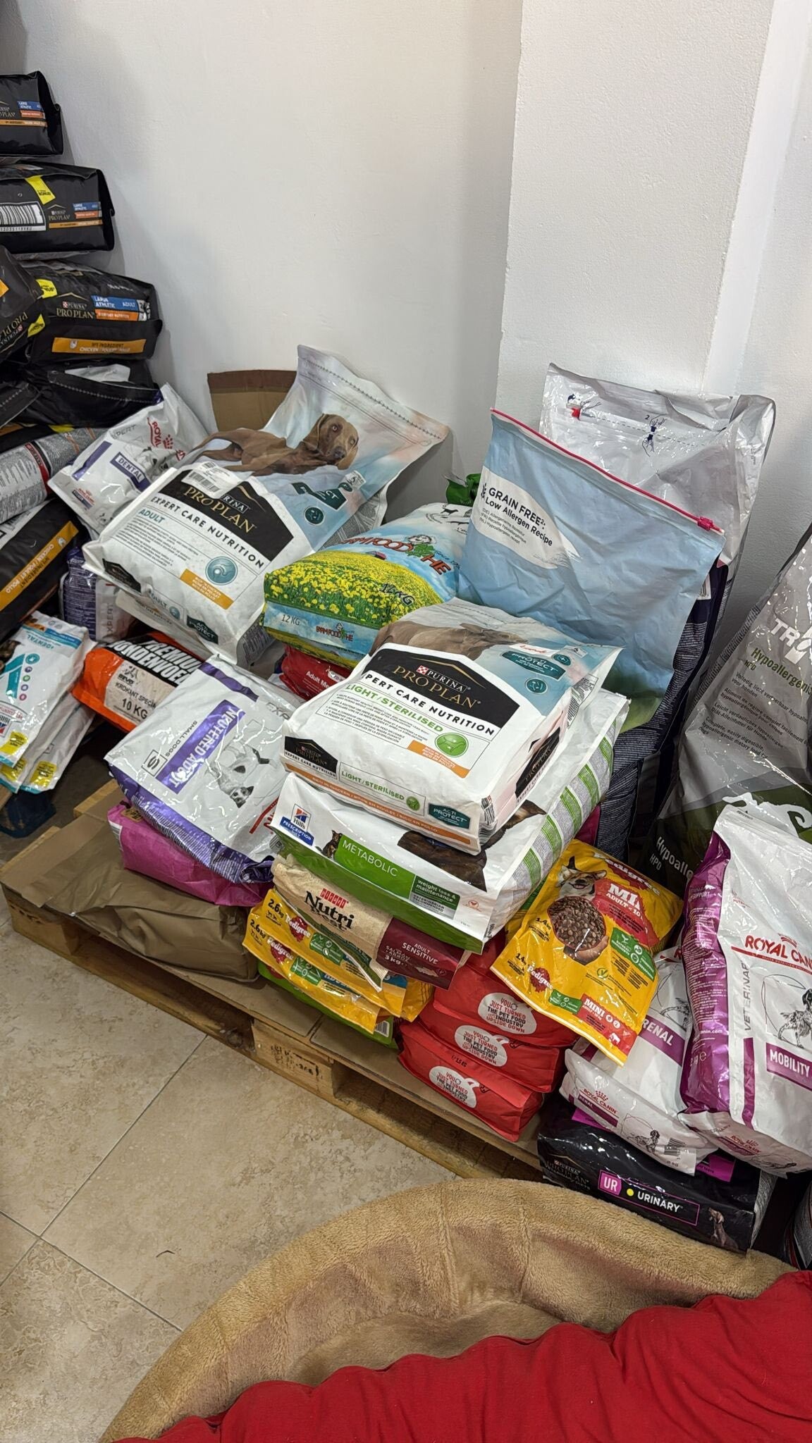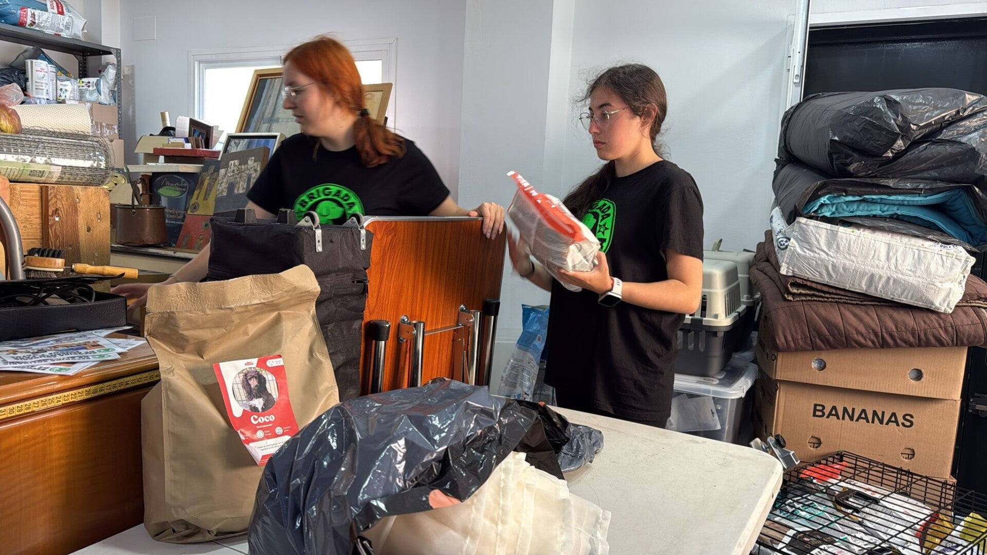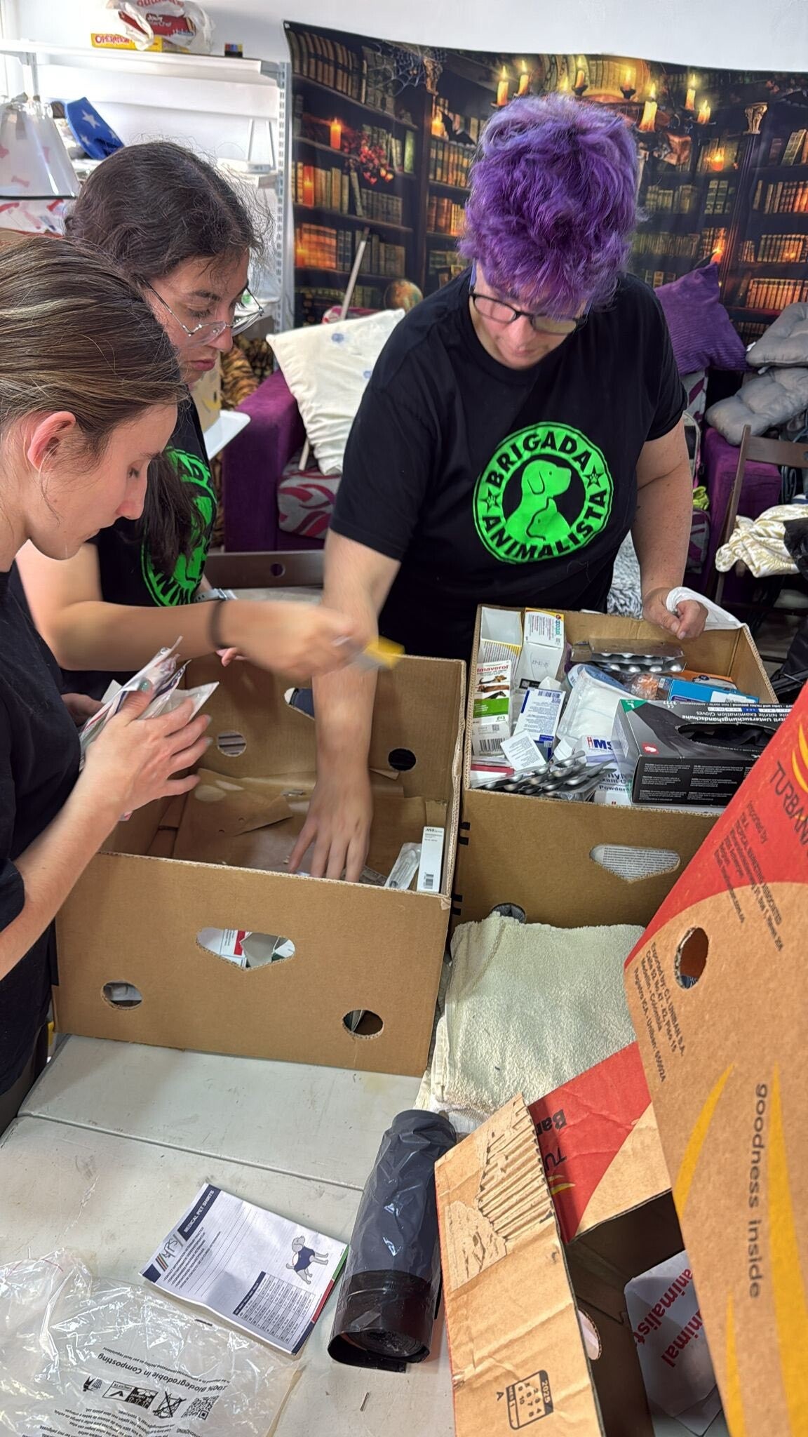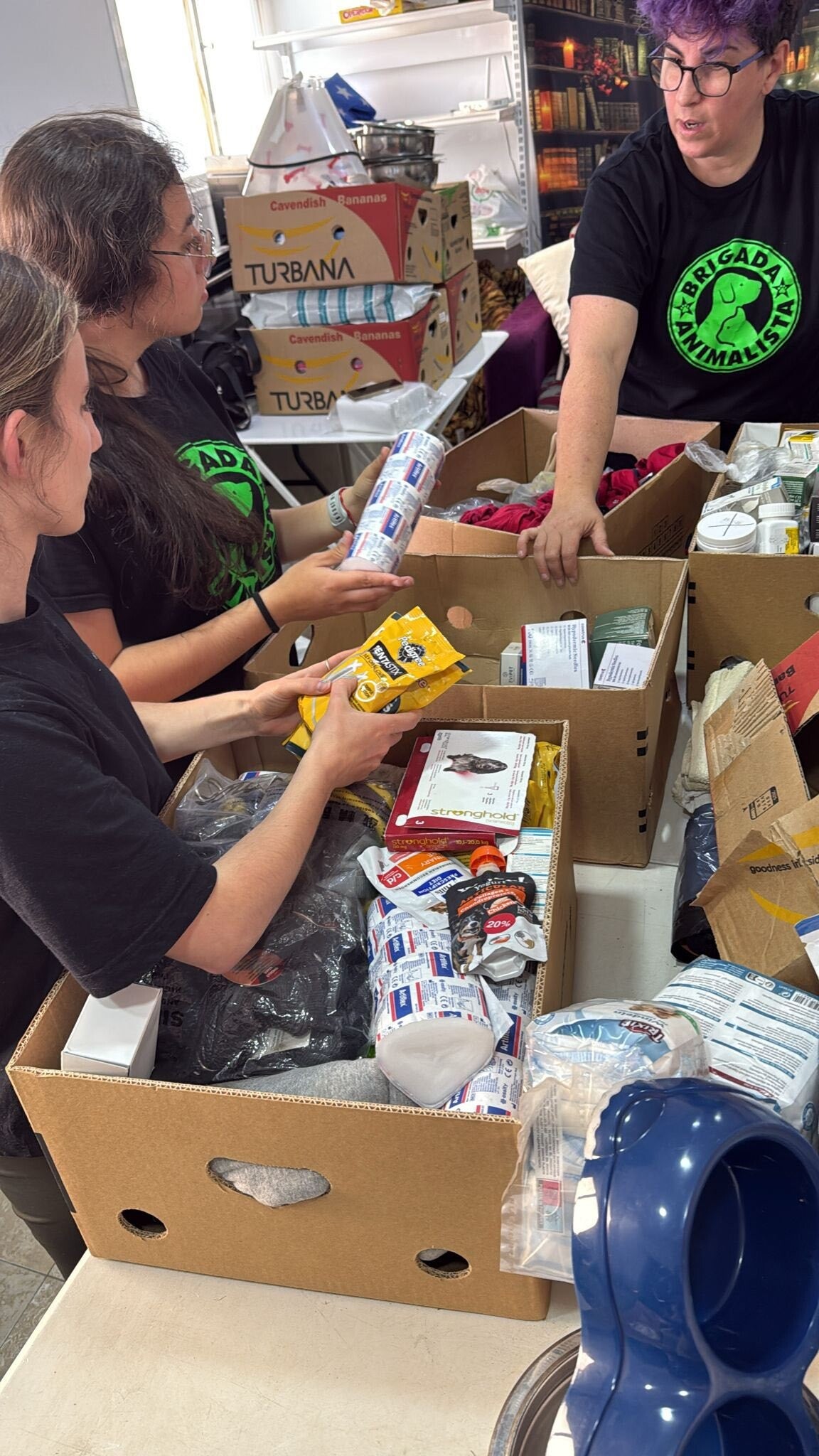 2 pallets met goederen voor de honden is aangekomen bij Asociación de Rescate Animal Brigada Animalista. De dames zijn druk bezig om de dozen uit te pakken, elke doos is een verassing. Voer, snacks, medicatie enz , ze zijn er zo blij mee.