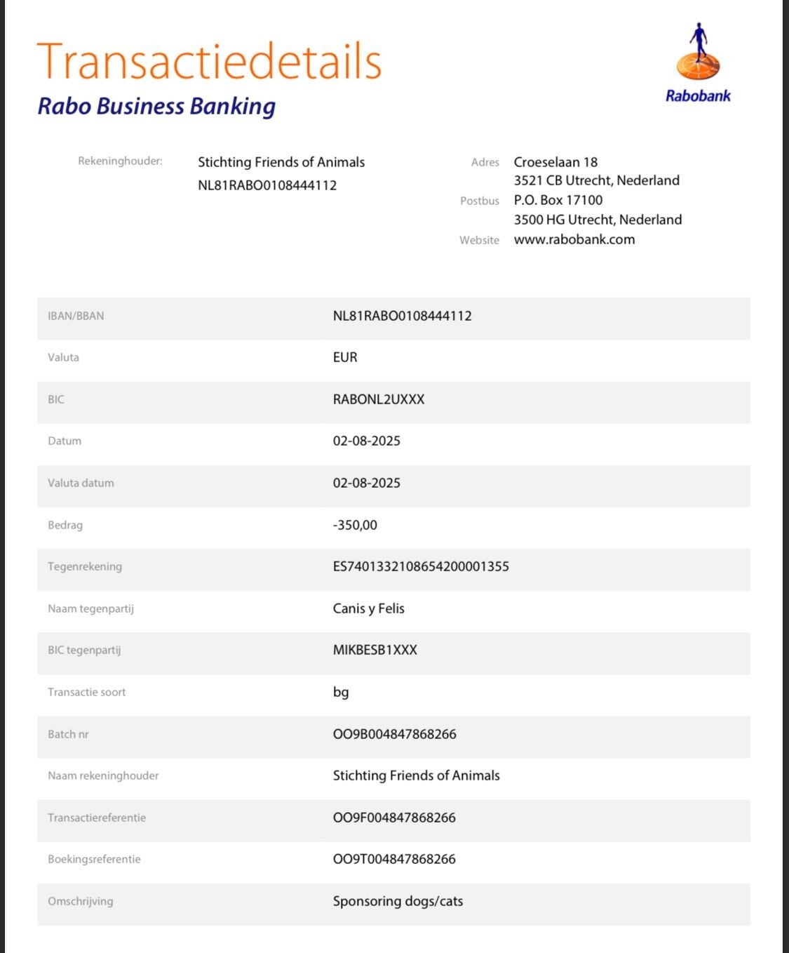 Vandaag hebben we het geld van de gesponsorde dieren overgemaakt naar de asielen waar de honden/katten verblijven die een fosterbaasje hebben gevonden.