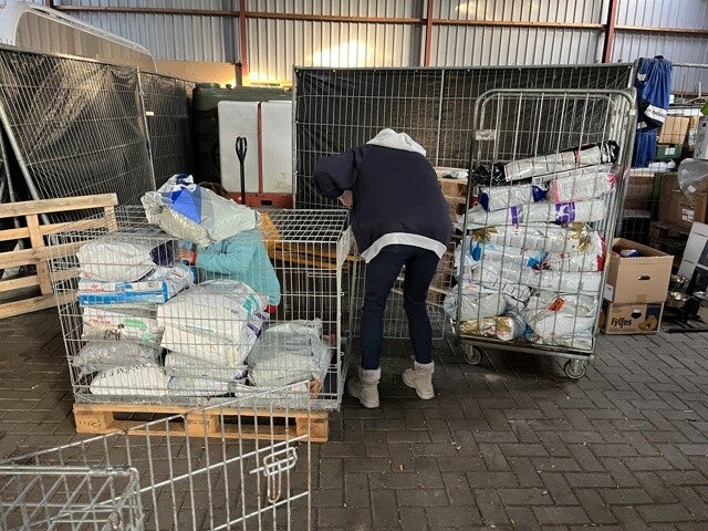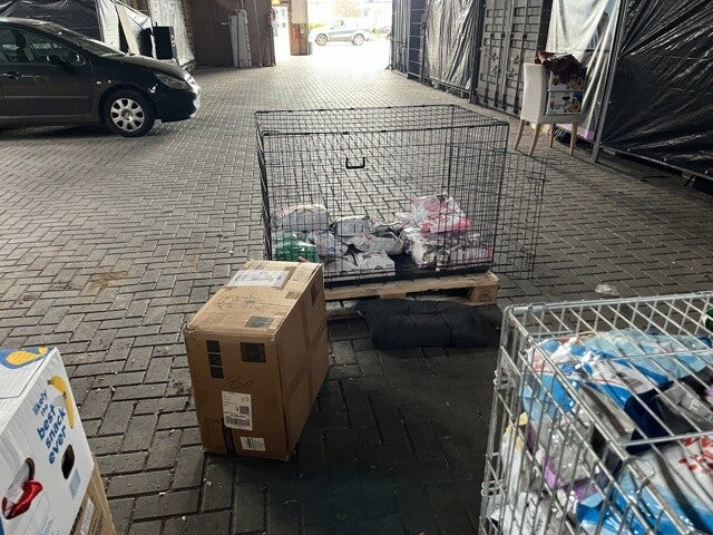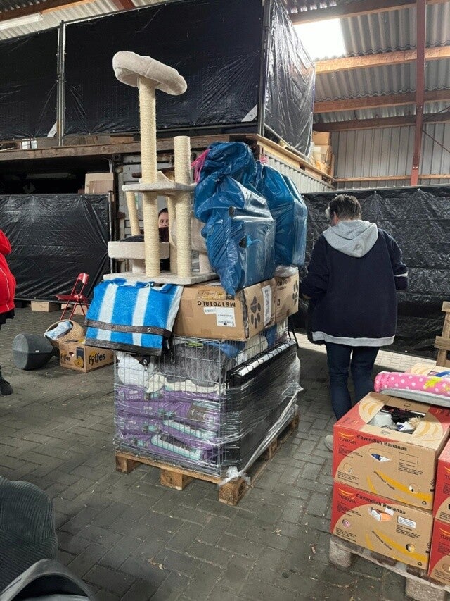 Heel veel voer op de pallets, krabpalen, manden, medicatie enz enz.