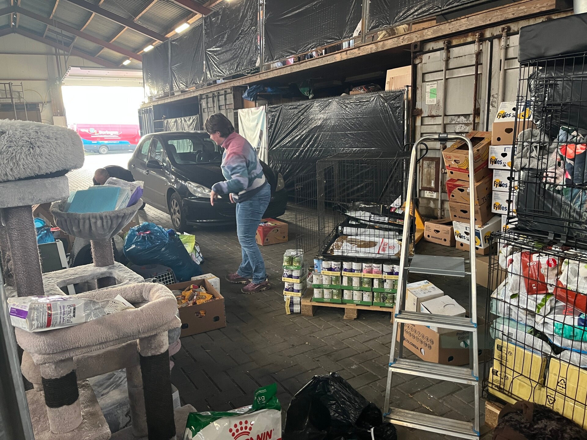 3 pallets met goederen voor de honden en 2 pallets met goederen voor de katten.