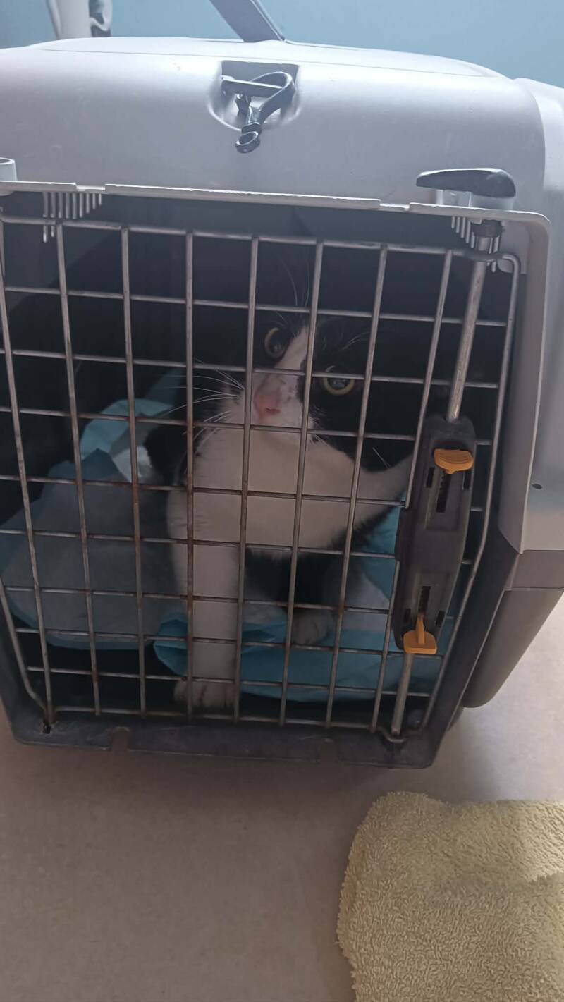 De poezen zijn krols en Manolito is een paar dagen weg geweest en zo kwam hij terug in de kolonie. Ana ging de kolonie voeren en zag dat hij 3 gaten in zijn buik had. Ze heeft hem meegenomen en naar de dierenarts gebracht. De wonden zijn gehecht en hij krijgt nu een antibiotica kuur