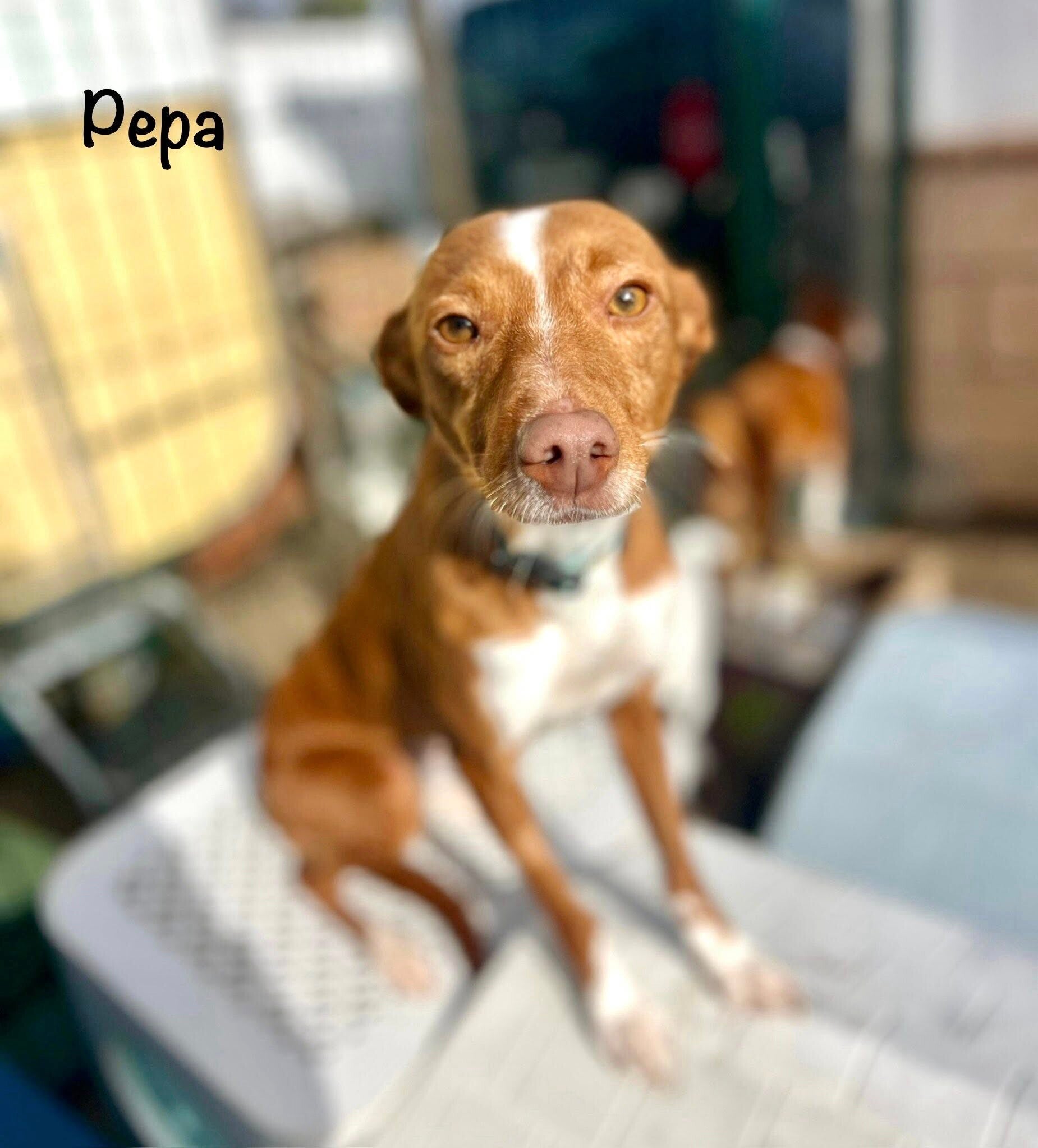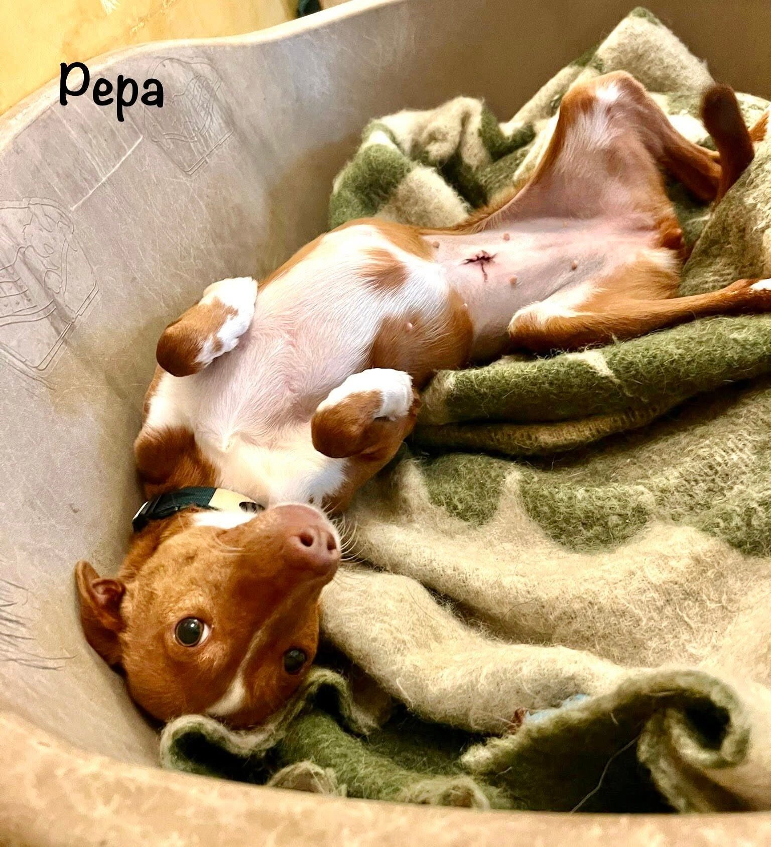 Deze vrolijke kleine Podenco heet Pepa. Ze is geboren op 1 januari 2023. Ze is piepklein, weegt slechts 7,5 kilo en is kerngezond. Een jager gaf Pepa aan ons omdat hij haar niet meer wilde; ze was niet "nuttig" voor hem. Er zouden twee pups komen, maar toen we ze opnamen, was alleen Pepa nog over en we hebben nooit ontdekt wat er met haar zusje is gebeurd. Pepa kan goed overweg met honden van alle groottes en geslachten, en ook met katten. Ze is een beetje verlegen, maar erg aanhankelijk en knuffelig. Zodra je iets tegen haar zegt, gaat ze op haar rug liggen en trekt ze gezichtjes waar ieders hart van smelt.